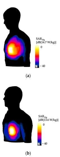 Moreover, the obtained values of the peak SAR10g are in line with the data reported in the literature. In fact, Ali et al. [11] estimated the peak SAR10g to be equal to 8.16 W/kg when a simplified human arm, made of skin, fat, muscle, and bone, was exposed to the radiation emitted by a wearable antenna tuned at f = 2.4 GHz with an input power of 0.5 W. Moreover, Chahat et al. [4] have exposed a rectangular parallelepiped homogeneous phantom to a wearable antenna at f = 2.45 GHz and the peak SAR1g obtained for an input power of 1 W was 48 W/kg. Evaluating the average of the peak SAR1g across all the simulations here implemented (data not shown), except for the antenna positioning close to the head, resulted in a SAR1g of about 34 W/kg. Finally, Chahat et al. [1] have simulated an antenna tuned at f = 2.45 GHz on two heterogenous adult phantoms (Duke and Ella models); the peak SAR1g obtained when the antenna was positioned on the model torso ranged from 18.7 to 30.7 W/kg for an input power of 1 W. Similarly, evaluating the peak SAR1g from our simulations when the antenna was posed on the torso for a frequency of 2.45 GHz, it ranges from 26.4 to 29.2 W/kg for 1 W of input power.
