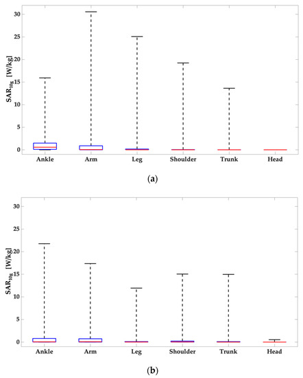 Descriptive statistics (minimum, 25th, 50th, 75th percentile and maximum) of the SAR10g distributions in the tissues included in volume of interest relative to the analyzed anatomical district: (a) Duke and (b) Ella.