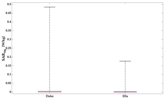 To better characterize the SAR10g distributions in the region of interest, Figure 4 shows the descriptive statistics (minimum, 25th, 50th, 75th percentile and maximum) of the SAR10g distribution evaluated in the tissues included in the cubical box identified in the anatomical district of interest with respect to the antenna positioning. From the top to the bottom of Figure 4, the panels are relative to Duke (Figure 4a) and Ella model (Figure 4b). All the panels clearly show that, for all the configurations, there is a great gap between the maximum value and the 75 percentiles of the distribution. As a general trend, it is therefore reasonable to assume that the large part of the values of the SAR10g distributions obtained are well below their peak values.