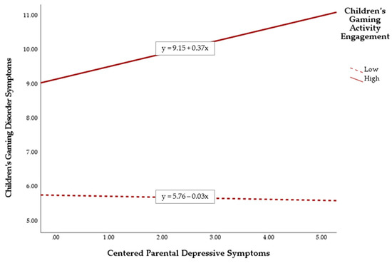 Plot of simple slope analysis for unpacking the significant interaction between parental depressive symptoms and children’s gaming activity engagement.
