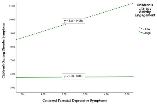 Second, children’s literacy activity engagement negatively moderated the hypothesized positive association between parental depressive symptoms and children’s GD symptoms, B = −0.48, t = −2.53, p = 0.01.