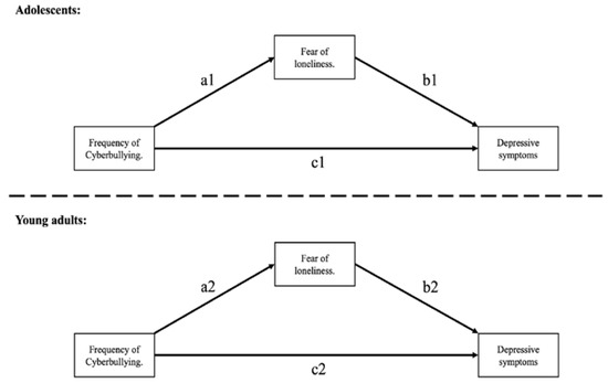 Figure 1 describes the proposed mechanism in which the frequency of cyberbullying has an impact on depressive symptoms by increasing the fear of loneliness. The effect of frequency of cyberbullying to fear of loneliness is thought to be conditional to the age group of the participants, reflecting a differential effect through different life stages. Paths “a”, “b” and “c” are numbered, where “1” refers to the group of adolescents, and “2” refers to the group of young adults.