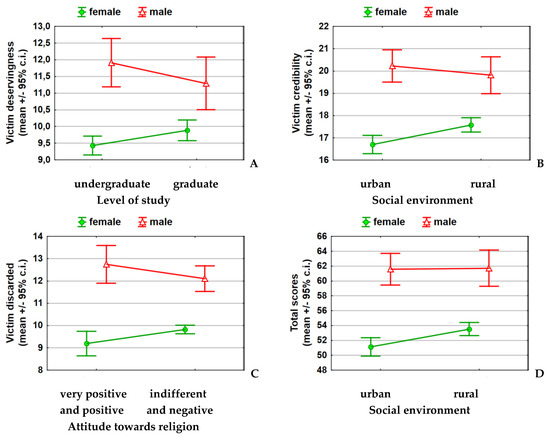 - The dimension of ARVS: all partial results and the total result are statistically significantly influenced by gender and the field of study, while in terms of gender (men vs. women), women are characterized by lower results assessed in the ARVS scale, i.e., higher empathy in relation to victims of rape (coefficient ß is positive in all cases), and in the case of the field of study (medicine vs. other), lower ARVS scores, i.e., higher empathy distinguishes respondents studying medicine (coefficient ß is negative in all cases).