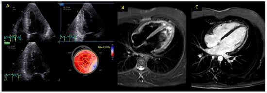 Panel (A) 17-segment bull’s-eye representation of LV strain in a patient with COVID-related myocarditis. Myocardial deformation (GLS—13%) was moderately impaired, especially in the lateral wall. Panels (B,C): cardiac MRI of the same patient, showing presence of myocardial edema in the stir T2-weighted sequence (Panel B) and of sub-epicardial scar tissue in lateral wall (Panel C) by LGE analysis.