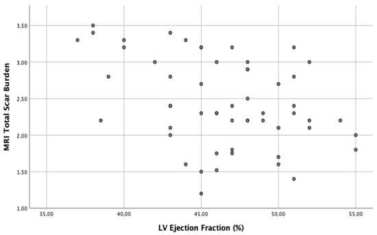 Scatter plot of negative correlation (r = −0.4, p < 0.01) between TSB (total scar burden) and baseline LVEF (left ventricular ejection fraction) in patients with myocarditis.