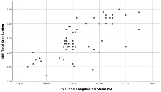 Scatter plot of positive correlation (r = 0.65, p < 0.0001) between TSB (total scar burden) and baseline LVGLS (left ventricular global longitudinal strain) in patients with myocarditis.