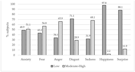 - Section 3: emotional reactions to the pandemic (nine items): the section explored the intensity experienced as a state of a range of positive and negative emotions (e.g., fear, sadness, anxiety, anger) experienced as a state (not as an emotional trait); the answers were rated on a seven-point Likert scale (1 = not at all, 7 = very much);