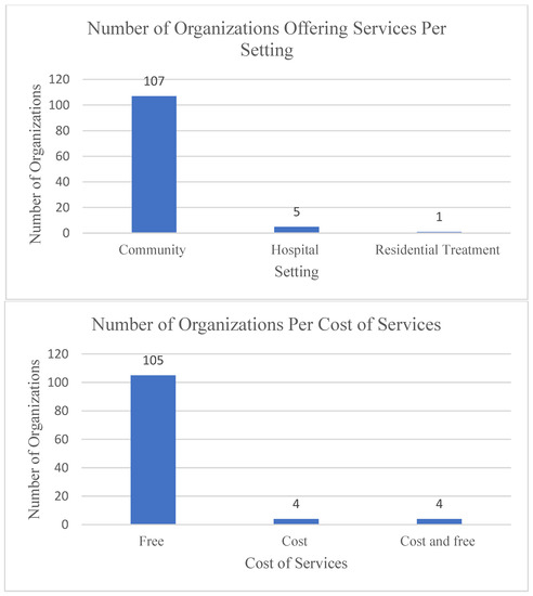 Number of organizations offering services per setting and per cost of services (n = 113).
