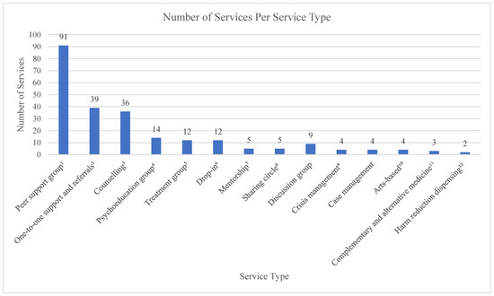 Most population-based mental health and substance use services geared towards LGBTQ2S+ youth in Ontario were either free or included some free aspects (Figure 2). This is to be expected as individual private mental health practitioners were excluded from the environmental scan. Peer support groups were the most frequently available form of support at 91 of all specific services. Peer support groups along with several other modalities of services operate as entry points into the mental health system, consisting of 78.33% of services across the province. These are valuable services where individuals can be introduced to many topics around mental health and receive education around treatment options and referrals. They are also important sources of support for the social and cultural domains of mental health through sharing of common experiences and the recognition of social and political determinants of health, which can lead to the alleviation of shame and improve self-acceptance. For those that experience added layers of disenfranchisement, they can also be a valuable source of meeting basic needs such as food for those with limited financial resources, or information sharing around navigating the health care or immigration systems for those that are newcomers to Canada [43].