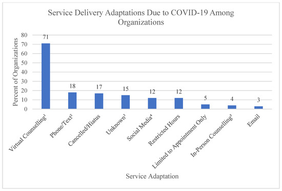 Service delivery adaptations among organizations (n = 113). 1 Virtual counselling includes any form of counselling that is identified as taking place in a virtual or online setting, such as Zoom. 2 Phone/Text refers to the use of either phone calls or text messaging as a means of service delivery. 3 Unknown refers to programs that did not specify the adaptations made to their services. 4 Social media refers to the use of social media platforms such as Facebook, Instagram or Discord as an adaptation to service. 5 In-person counselling refers to programs where no adaptations or changes were identified to the in-person counselling services.
