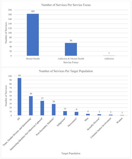 Number of Services per Service Focus and Target Population (n = 240). 1 Category includes trans, non-binary, and/or gender non-conforming; gender expansive, trans and non-binary identities; transgender and gender diverse; trans and gender diverse; trans and non-binary-identified; trans and gender non-conforming; trans, two spirit, gender non-conforming, or otherwise not cisgender; trans, two-spirit, and gender-diverse; trans and gender-independent; two-spirit, trans, gender non-binary, gender-queer, and gender non-conforming; trans, non-binary, and two-spirit; trans, non-binary and gender-diverse; trans, non binary and two spirit people; trans/2-spirit and non binary; transgendered and gender non-conforming; gender diverse; experiencing gender dysphoria; gender diverse, trans, non-binary and questioning; experiencing or questioning changes on the gender spectrum; trans, non-binary, gender non-conforming and gender questioning; transgender and those struggling with gender identity issues; trans men, trans women, non-binary, gender variant folk, and people who are questioning; trans, nonbinary, genderfluid, or who are questioning their gender identity; transgender; trans; transgender and questioning; trans and questioning; Transgender women; Non-Binary; Transmasc. 2 Category includes people labelled with intellectual disabilities; Women who are black, indigenous, queer, trans, people of colour; People who identify as both Muslim and queer/trans; East and Southeast Asian identity; Indigenous ace community members; Francophone; Living with a mood disorder; south Asian guys who like guys; Bi+ men (including trans men) and non-binary folx; Bi+ women (including trans women) and non-binary folx; East and Southeast Asian men; Black African Caribbean Trans/2Spirit and Non Binary; Youth who use substances; Gay or bisexual men living with Human Immunodeficiency Virus (HIV) Black Trans women and Non-Binary people; Tamil men who like men; People from diverse cultures; Gender and sexually diverse refugees living in Turkey; black gay, bisexual, queer, questioning, trans* and other men who have sex with men (MSM); black guy into guys; QTBIPOC (Queer and Trans Black, Indigenous, and Person of Colour); Queer and Trans BIPOC survivors of sexual and gender based violence. 3 Category includes post-secondary students; post-secondary trans and non-binary students; post-secondary transgender and/or non-binary students; post-secondary students who are trans, two-spirit, non-binary or other gender diverse people; Post-secondary students who are women who are also attracted to women; Post-secondary and bisexual, pansexual, polysexual, and other mspec students; Post-secondary students who identify as disabled or a person with a disability; Post-secondary and international students; Post-secondary and trans students; Post-secondary black 2STLGBQIA+ students; Post-secondary students identifying with or experiencing social anxiety, shyness, and awkwardness; Post-secondary students who are 2STLGBQIA+ Black, Indigenous, and People of Colour; Post-secondary students who are men who are also attracted to men; Post-secondary and asexual and/or aromantic students. 4 Category includes 2-spirit, including First Nations, Metis and Inuit; two-spirit and Indigenous; two-spirit and trans Indigenous; Indigenous; two spirited; 2S trans Indigenous; two spirit and trans Indigenous. 5 Category includes newcomers, African, Caribbean and Black (ACB) newcomers. 6 Category includes sexually diverse; bisexual, pansexual, bi-curious, and questioning; bisexual, pansexual, 2 spirit, fluid and other non-monosexual people, and those questioning.