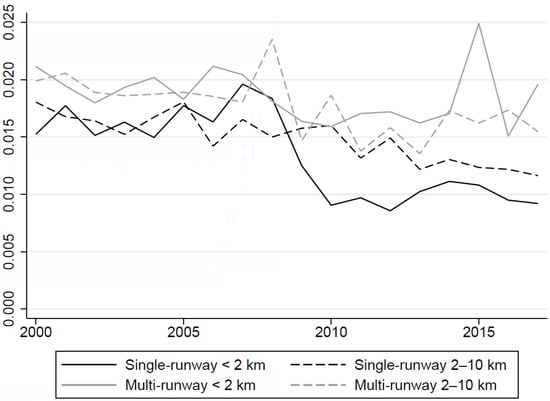 Figure 3 shows cardiovascular mortality rates near single- and multi-runway airports during the study period in the matched and weighted sample, again using the 2 km cutoff to define treatment and control groups near each airport type. The figure shows that cardiovascular mortality rates were somewhat lower near single-runway airports than multi-runway airports. Though there was substantial year-to-year variation, mortality rates were generally similar across the treatment and control groups near each airport type.