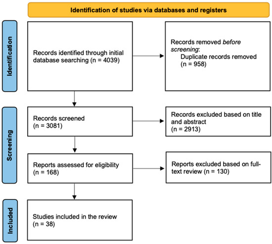 After systematically searching the two databases, we initially included a total of 4039 articles. After removing duplicates, we screened 3081 articles based on their titles and abstracts. Of these, we retrieved the full texts of 168 for a full eligibility assessment. Ultimately, we included 38 articles in the final review (Figure 1).