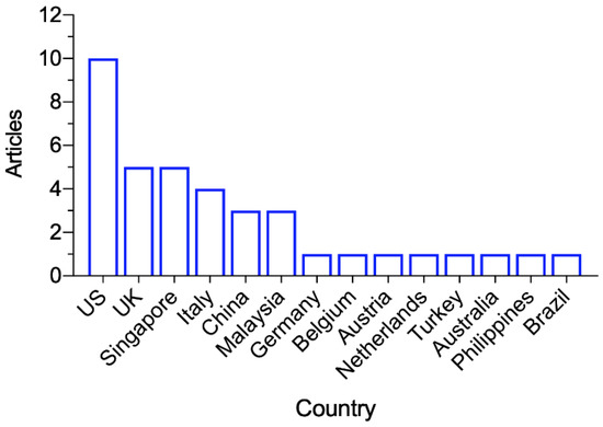 The 38 articles were published between April 2020 and March 2022, with the most in the second quarter of 2020 (n = 12), during which the WHO dashboard showed a global surge of confirmed COVID-19 cases [2]. Figure 2 shows the publication dates for the included articles. As shown in Figure 3, the studies were conducted in the following countries: the US (n = 10), UK (n = 5), Singapore (n = 5), Italy (n = 4), China (n = 3), Malaysia (n = 3), Germany, Belgium, Austria, Netherlands, Turkey, Australia, Philippines, and Brazil (n = 1 from each).