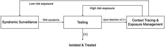 Syndromic surveillance facilitates the early detection of COVID-19-related symptoms. Upon onset of symptoms, HCWs are generally required to report to their relevant departments for testing. In some cases, symptomatic HCWs will initially be given medical leave for a five-day home quarantine; if symptoms continue, they will then be appointed for testing [22]. Once a positive case is, thus, identified, the case is isolated and treated. Meanwhile, contact tracing is initiated [52]. During this process, information will be obtained and collated on the individuals who have been in contact with the index case. Accordingly, identified contacts will be assessed for exposure risk and, thus, stratified based on the contact scenarios [52]. Those with high-exposure risk will be tested immediately, while those with low-exposure risk may be placed under daily syndromic surveillance for a period lasting 14 days after their most recent exposure [10]. Any contacts who present symptoms while under syndromic surveillance will be referred for testing. New rounds of contact tracing and exposure management will begin in cases where contacts are, thus, confirmed to have SARS-CoV-2 infections.