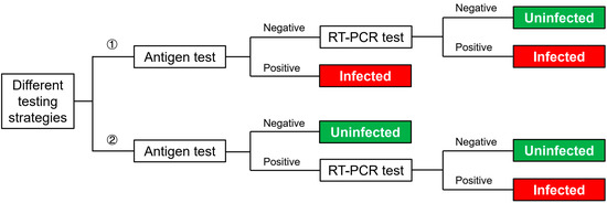 As the pandemic has continued for more than two years and continues to bring challenges to healthcare systems across the globe, antigen testing has been developed in response to the urgent need for rapid and visualized diagnoses of SARS-CoV-2. Despite its relatively lower sensitivity compared with RT-PCR due to methodological reasons, the antigen test has unique advantages, such as a short testing time of up to 15 min, and independent to equipment and trained professionals to interpret the results. According to the current CDC recommendation, the frequency of the antigen test can be considered as a break-controlling measure [58]. Additionally, it has been reported that compared with traditional measures of placing exposed HCWs under 14-day quarantine, antigen tests for those HCWs every other day will reduce the total cost by 87% [27]. On the other hand, antigen tests have been widely used for the screening of at-risk populations, together with a follow-up RT-PCR test for confirmation, which greatly improves the testing efficiency [45]. An effective strategy is to provide antigen tests for HCWs first, and (1) if tested with positive antigen results, they would be considered SARS-CoV-2 positive; or (2) if tested with negative antigen results, they would be provided with further PCR tests for confirmation [45]. Another strategy would be providing follow-up PCR tests only for those tested with positive antigen results (Figure 5) [46]. According to the CDC guideline, the specificity of the antigen test is comparable to the RT-PCR test, which means false-positive results are unlikely [58]. Thus, Kolwijck’s testing strategy is more rational as, in this way, PCR testing better compensates antigen testing’s inadequate detection limit.