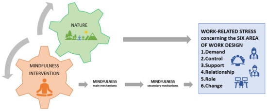 Nature acts in two different ways: On the one hand, nature directly affects stress and mental fatigue, which have a role in coping with demands and in increasing resources concerning the six areas of work design. Exposure to nature can reduce the negative mood state and enhance positive emotions, which in turn help in coping with stressful situations connected with high demands and increase social awareness so that individuals can relate with others more assertively and positively solve conflicts. Moreover, it contributes to mental fatigue restoration, with positive impacts on attention, increasing resources for controlling the way they develop their work, and helping in coping with highly demanding situations. Furthermore, exposure to nature has a calming effect, helping to reduce psycho-physiological activation during stress responses and protecting individuals against the impact of environmental stressors provoked by changes. On the other hand, nature can boost the effect of MBI in fostering mindfulness and, consequently, can improve all the positive effects of mindfulness that are already described. For example, contact with nature fosters cognitive performance, boosting the mindfulness’s effect on working memory, self-determination, and persistence, which are relevant for dealing with diverse demands and for the control of the way they develop their work. Moreover, contact with natural environments or elements as a part of mindfulness practice could boost the mindfulness effect on empathy, awareness, cognitive flexibility, and self-management skills of workers. The latter, in turn, contribute to developing positive interpersonal relationships, to the perception of their role within the organization, and to adjust effectively to change, reducing stress and promoting new response patterns. Figure 1 summarizes these mechanisms.