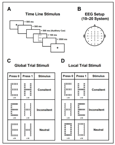 Figure 1. Hierarchical Visuospatial Aspect Recognition paradigm coupled with EEG. (A) The order and timing at which stimulus was presented were coupled with the EEG to create a window large enough for the collection of coherence data during visual object processing. (B) The placement of the electrodes on the scalp followed the international 10–20 system to assure standardization. (C) The stimuli selected for the Global Aspect Recognition trials comprised two consistent stimuli, two inconsistent and two neutral created with figures to avoid interference for the global visuospatial analysis. (D) The stimuli selected for the Local Aspect Recognition trials were the same for the consistent and inconsistent but differed from the global trial neutral stimuli since the global aspect created a figure (using the letters) to avoid interference of local visuospatial analysis.