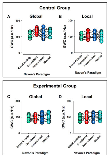 Figure 2. Pooled data for Global Mean-Weighted Coherence (GMWC), during Global (A,C) and Local (B,D) Aspect Recognition Test, for the control and experimental group, respectively. The individual values for each subject are represented with a number. In each case, the basal EEG activity, consistent, inconsistent, and neutral conditions are displayed. Note the interindividual differences. We observed higher values of GMWC in consistent and inconsistent Global Aspect Recognition in control group in comparison with ADHD group. Arbitrary units = a.u.; * = multiplication sign.