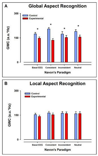 Figure 3. Comparison of the average Global Mean-Weighted Coherence (GMWC) obtained from control and experimental group. (A) GMWC for Global Aspect Recognition. (B) GMWC for Local Aspect Recognition. In (A,B), the basal EEG activity, consistent, inconsistent, and neutral conditions are displayed. Note that in A, there was a significant difference in the GMWC between the control group and the experimental group in all conditions. p < 0.05 is marked with *.