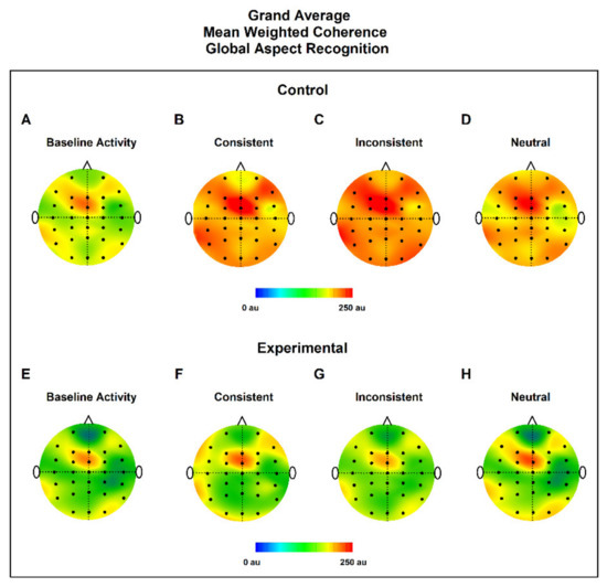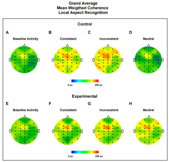 Data regarding EEG basal activity as well as Global and Local Aspect Recognition were included for analysis. We excluded segments contaminated with eye movement artifacts through visual inspection offline. EEG segments had a duration of 1000 ms, therefore, allowing a frequency resolution of 1 Hz for spectral analysis. We partitioned data into non-overlapping segments. The preprocess of EEG to quantify coherence was performed as in previous works [42,43,44]. EEG signals were first transformed into the reference-free current source density (CSD) distribution [45]. The CSD algorithm was estimated using the spherical spline interpolation method [46], implemented in the commercial software “Brain Vision 2.0.1” (Brain Vision Solutions Inc., München, Germany). For each subject, we had sequences of 80 segments of clean EEG (80 s). The discrete 29 = 512-points Fourier transform was computed for each segment for the whole 0–200 Hz. Moreover, data belonging to global and local (consistent, inconsistent, and neutral) recognition from all trials were concatenated for further statistical analysis.