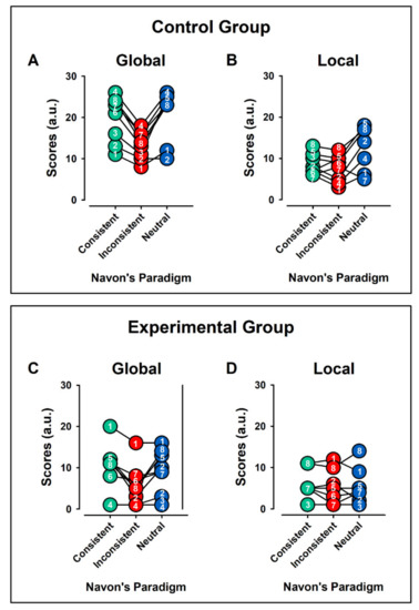 Figure 6. Pooled data of scores for all individuals, in Global (A,C) and Local (B,D) Aspect Recognition for control and experimental group, respectively. The individual values for each subject are represented with a number. In each case, the consistent, inconsistent, and neutral conditions are displayed. Note the interindividual differences. We observed higher values of scores in consistent Global Aspect Recognition in both groups.