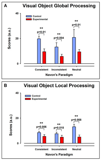 Figure 7. Comparison of the average scores of Navon test obtained from control and experimental group. (A) Scores for Global Aspect Recognition for consistent, inconsistent, and neutral stimulus. (B) Scores for Local Aspect Recognition for consistent, inconsistent, and neutral stimulus. Note that in all cases there was a significant decrease in the scores of the experimental group. p < 0.01 is marked with **.