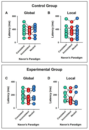 Figure 8. Pooled data of latencies for all individuals in Global (A,C) and Local (B,D) Aspect Recognition for control and experimental groups, respectively. The individual values for each subject are represented with a number. In each case, the consistent, inconsistent, and neutral conditions are displayed. Note the interindividual differences. We observed higher latencies in control group than in experimental group.