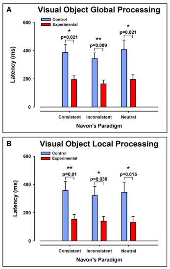Figure 9. Comparison of the average latencies obtained from control and experimental groups. (A) Latencies for Global Aspect Recognition for consistent, inconsistent, and neutral stimulus. (B) Latencies for Local Aspect Recognition for consistent, inconsistent, and neutral stimulus. Note that in all cases there was a significant decrease in the latencies of the experimental group. p < 0.05 is marked with * and p < 0.01 is marked with **.