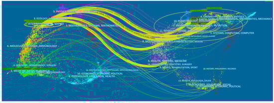 Via the “dual-map overlay” function of CiteSpace, we can construct the discipline co-occurrence network, as shown in Figure 2. The original map shows more than 10,000 journals indexed in Web of Science, which are divided into different disciplines in different colors and are located in different locations of the source (or left) region and the reference (or right) region. Among them, “source” refers to the relevant papers in a certain field for a certain period of time and “reference” refers to all references of the above papers. For example, the discipline “ECONOMICS, ECONOMIC, POLITICAL” is in lake-blue and it ranks the 10th in the source region and the 12th in the reference region [22]. Then we added a layer containing the 2215 bibliographic records on urban HIA, which became the colorful links between the source region and the reference region.