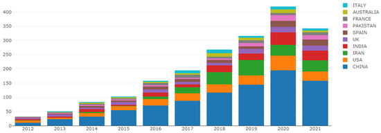 Figure 3. Since the Online Analysis Platform for Bibliometrics can only automatically generate the top ten countries, the situation of annual publications in other countries cannot be seen in this figure. The number of articles issued in China, Iran and India has shown a rapid growth trend from 2012 to 2021.