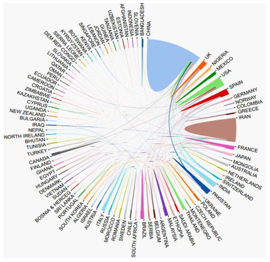 The cooperative relationship between countries is shown in Figure 4. Among them, authors from CHINA, IRAN, USA, and SPAIN have more cooperation with authors from other countries.