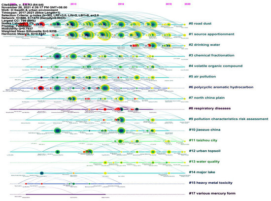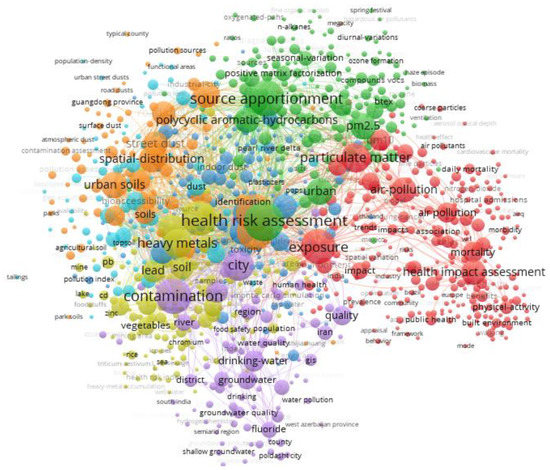 Cluster #0 represented “road dust” with 121 members. In the representative publications, Moryani et al. (2020) evaluated the pollution level of heavy metals (Cu, Pb, Zn, CD, Ni, Sb, Cr) in five parts of road dust in four different regions of Karachi and Shikarpur by calculating the pollution index enrichment factor and Igeo; the health risk assessment was carried out according to the carcinogenic risk methods and hazard index [47].