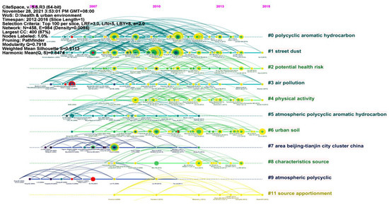 Cluster #0 was the largest cluster and represented “polycyclic aromatic hydrocarbons” with 64 members. In the representative publications, Yu et al. (2014) identified the potential sources of polycyclic aromatic hydrocarbons (PAHs) in 87 urban street dust samples from Tianjin as a Chinese megacity and evaluated the risk of PAHs to urban residents using the incremental lifetime cancer risk model [24].