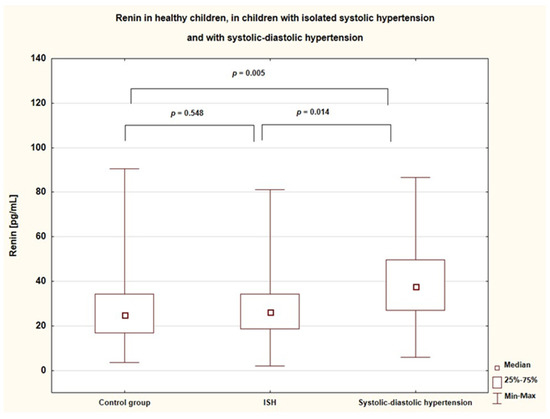In the hypertensive group, patients suffering from both systolic and diastolic hypertension (n = 21) had significantly higher levels of active renin than patients diagnosed with isolated systolic hypertension (n = 30) (37.8 [27.0–47.6] vs. 26.2 [18.6–34.2], p = 0.014) and healthy children (p = 0.005). Patients with isolated systolic hypertension did not differ significantly in renin concentration from healthy subjects (p = 0.548). (Figure 1).