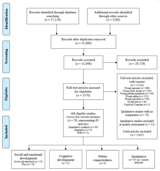 Figure 1 presents the summary of results from the systematic literature search. After duplicates were removed, 31,098 articles remained, of which 29,729 irrelevant titles and abstracts were excluded leaving 1370 full-text articles to be screened. 1224 full-text articles were excluded for reasons detailed in Figure 1. Seventy qualitative studies were removed because they did not have a comparator (i.e., exposure, control group, pre/post) as did a further 11 studies after having their trustworthiness assessed. A total of 59 unique studies (representing 65 individual papers) met the inclusion criteria (including the physical outcome domain which is presented in another paper), of which, 36 studies (representing 40 individual papers) included a social and emotional, cognitive, and/or nature connectedness outcome (26 quantitative; 9 qualitative; 1 mixed-methods).