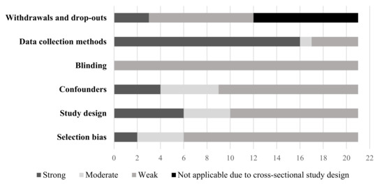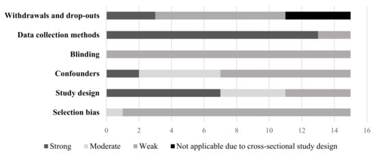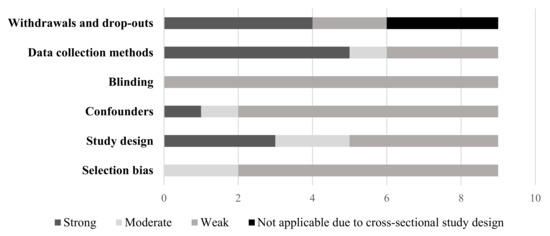 The quality of each quantitative study, as assessed by the EPHPP tool, can be found in Supplementary File S3. Of the eligible studies, only two studies were of moderate quality [46,48] with the remaining rated as weak. Of the two studies rated as moderate quality, they represented the nature-based ECE (n = 1) [46] and ECE natural playgrounds (n = 1) [48] exposures. Figure 2, Figure 3 and Figure 4 present the quality rating across the quantitative studies by assessment item per outcome category. Typically, items were rated weak because of selection bias, study design, issues around confounding, and transparency over whether the researchers or outcome assessors were aware of the research questions (blinding). A weak rating for study attrition (withdrawals and dropouts) was provided in 67% of before and after studies. Data collection methods tended to be valid and reliable.