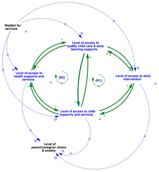 Two primary feedback loops (R1, R2) influence the relationships in the CLD. The interrelationships between variables represented by Theme 3.1 are reflected in Figure 1, with relevant feedback loops summarized in Table 2. Entry into community services through any one of the four types of community services (i.e., child care and early learning, early intervention, child supports and services, health supports and services) leads to an increased likelihood of accessing each of the other types of community services and programs. Through these key entry points to service access, parents/caregivers are able to receive information about available services and programs through other parents/caregivers and/or service providers, as well as indirect or direct referrals to other types of community services.