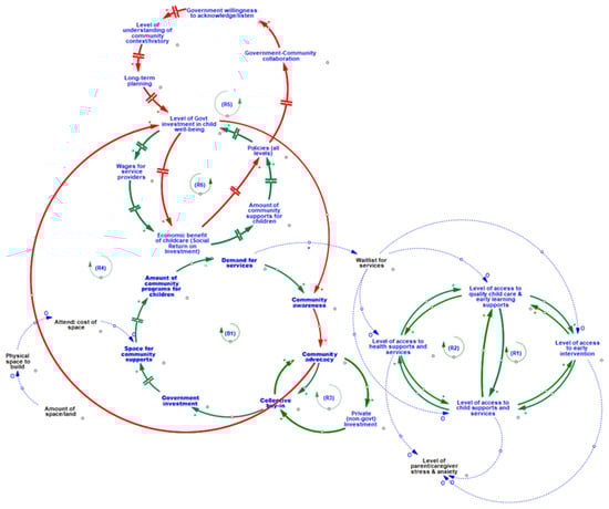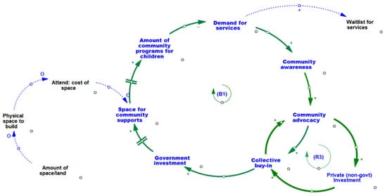 Thus far, we have presented a number of CLDs that effectively stand alone as ways of describing the thematic dynamics operating within the subsystem of community-level variables. One of the advantages of systems dynamic modeling is that the CLDs and the variables contained within subsystems can be combined to create a more complete and nuanced picture of the situation, thereby improving our ability to understand the relationships between different levels of interaction within the system. Bringing together loops B1, R1, R2, R6, R5, R3, R4, and including additional variable, such as parent/caregiver stress/anxiety, waitlists for services, amount of space/land, physical space to build, and cost of space reveals a CLD that explicates the connections between different thematic areas within the community-level or neighborhood environment subsystem (see Table 2 and Figure 4).