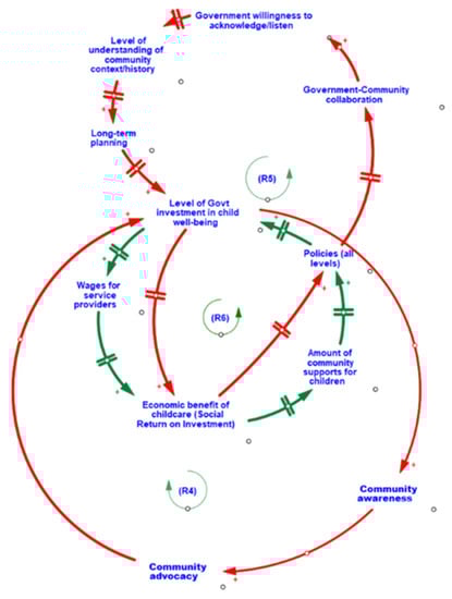 In loop R5, the level of government investment in children’s well-being at a community level is impacted by the government’s efforts and willingness to collaborate with the community on local initiatives and to acknowledge, listen, understand, and be responsive to local contexts, histories, perspectives, needs, and priorities. This, in turn, impacts the government’s willingness to engage in long-term planning to collaborate with communities towards shared goals. Loop R6 further highlights the important role of government to support longer-term returns on investment through investments in the human capital required (i.e., adequacy/amount of wages for service providers) to enable greater availability and quality of community supports for children and families.