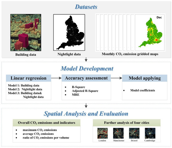 We used linear regression models to estimate monthly building-based CO2 emissions in England in 2015 based on emission data from EDGAR and two factors (night-time lights and building data). The overall framework of this study is illustrated in Figure 2, which can be broken up into three parts: (1) dataset preparation, in which we collected and processed the relevant data as model variables; (2) model development, wherein we constructed three linear regression models with different factors, verified the model performances using three accuracy assessment indicators, and applied the model with the best performance to estimate monthly building-based CO2 emissions; (3) spatial analysis and evaluation, including analyzing the spatial distributions and seasonal characteristics of building-based CO2 emissions in England using multiple metrics and conducting a further analysis on four typical cities.