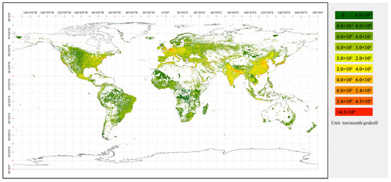 The EDGAR dataset was provided by the EU-JRC and the PBL. It contains global gridded carbon emission data from various sectors at a 0.1° × 0.1° resolution, including agriculture, power, transport, residence, industry, manufacturing, and more [22,31,32,33]. The CO2 emissions data of EDGAR were derived from the national CO2 statistic reported by the Global Carbon Project and broken down to IPCC-relevant source-sector levels. EDGAR is a well-known dataset for its reliability and accuracy of data quality and thus has been widely applied in various environmental research and management [20,26]. The monthly CO2 emissions for 2015 in the energy sector for buildings originating from EDGAR (https://edgar.jrc.ec.europa.eu/gallery?release=v50&substance=CO2_org_short-cycle_C%20§or=RCO, accessed on 4 May 2020)were used in this study as the ideal input data for building-based CO2 emission estimates (Figure 3).