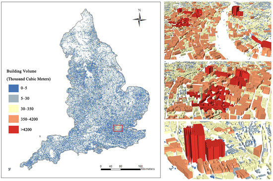 Buildings are an important unit of urban three-dimensional structures that significantly influence land use type, development of infrastructure, efficient use of natural resources, and CO2 emissions [34,35,36]. The building volume, which refers to the volume of a building in space, is considered an important driving force accelerating urban carbon emissions [37]; thus, building volume is considered an important indicator of urban energy efficiency and CO2 emission levels. To calculate the volume of each building in England, we collected building data on the building footprint and height data provided by Emu Analytics (http://buildingheights.emu-analytics.net, accessed on 4 May 2020). The building footprint data were obtained from the Ordinance Survey Open Map (https://www.ordnancesurvey.co.uk/business-government/tools-support/open-map-local-support, accessed on 4 May 2020), which includes nearly 12 million publicly available building footprints in England, while the building height was calculated from 1 m resolution light detection and ranging (LiDAR) images. The calculations for building height are shown in Figure 4.