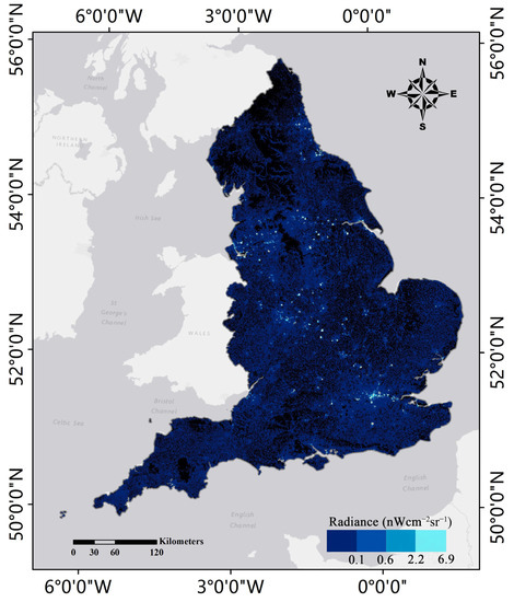 where is the night-time light value of building j in county k, is the total night-time light value in grid t, where the building is located, is the footprint area of building j in county k, and is the area of grid t. According to Equation (2), the night-time light value of a single building in each month was calculated and collected. Figure 5 shows the distributions of night-time light values for each building in England in January.