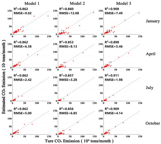 To verify the effectiveness of the three models in estimating CO2 emissions from buildings, we constructed scatterplots of county-scale true and estimated CO2 emissions for regression Models 1–3, as shown in Figure 6. Each model type was tested in January, April, July and October. The horizontal axis represents the actual CO2 emissions from buildings in each county counted from the EDGAR grid map, and the vertical axis represents the CO2 emissions from buildings estimated by the three models. For Model 1, the scatter points are more evenly distributed on both sides of the trend line, though there was considerable under- or over-estimation of CO2 emissions in a few counties. For Model 2, most of the scatter points are below the one-to-one diagonal, and the RMSE of Model 2 was also the largest among the three models, suggesting that CO2 emissions were severely underestimated. In Model 3, the points are adjacent to the one-to-one diagonal, which is the best fit of the three models. The R2 and RMSE values further verify that the simulated values in Model 3 were closest to the predicted values. In July, the R2 of Model 3 was enhanced from 0.862 to 0.911 when compared to the Model 1, and from 0.857 to 0.911 when compared to the Model 2, indicating that this model has the best fitting accuracy and highest feasibility. Moreover, the results also indicate that Model 3 maintains a degree of stability in estimating results in different months, with the value of R2 varying only between 0.89 and 0.91.