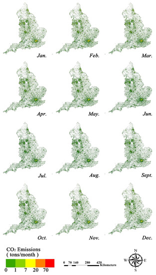Based on the models and coefficients in Table 2, we successfully downscaled the CO2 emissions from the EDGAR grids to individual buildings by coupling the building data and night-time light data. The spatiotemporal variations in CO2 emission data from buildings at the national scale are presented in Figure 7. CO2 emissions from buildings in England showed obvious seasonality, being significantly higher in winter than in summer. EDGAR grid maps showed that, in winter, there were many areas scattered with red buildings, where the CO2 emissions from a single building exceeded 70 tons a month, whereas in summer, most urban centers are only scattered with orange buildings, where the CO2 emissions were less than 70 tons a month. According to one report [54], the average temperature in England in January is 4–7 °C, and the average temperature in July is 13–17 °C. The fact that CO2 emissions from buildings are significantly higher in winter than in summer may be due to winter heating, which causes more energy consumption.