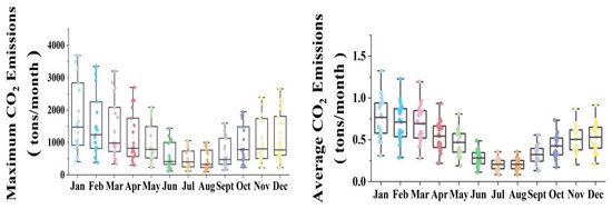 We obtained the maximum and average CO2 emissions from buildings for each county in England (Figure 8). We found that both maximum and average CO2 emissions from buildings varied significantly in different counties and months. Clear “V” shapes in the boxplot indicate that the CO2 emissions in nearly all counties decreased from January to July and increased from August to December. In particular, the discrepancy in CO2 emissions between different counties was much larger in winter than in summer. It should be noted that the discrepancy in the maximum CO2 emissions in all months was larger than the discrepancy in the average CO2 emissions, which indicates that some buildings have extremely high CO2 emissions.