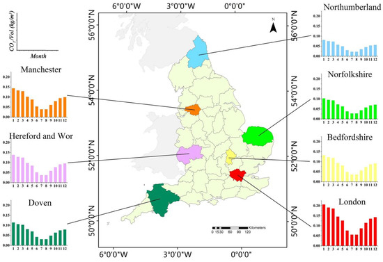We selected seven counties, and the corresponding statistical bar graphs were drawn from the ratio of CO2 emissions per volume (CO2/Vol) for each selected county, as shown in Figure 9. The monthly changes in the CO2/Vol of buildings in each selected county have the same “V-shaped” trend, representing slight declines from January to July, reaching the lowest value in July and August, and subsequently increasing from September to December. In addition, the absolute ratio of CO2/Vol varied greatly among the different regions. For instance, as a typical metropolis, the CO2/Vol of Greater London County was relatively high, at 0.206 kg/m3 in January and 0.055 kg/m3 in July. In Northumberland, in northern England, the CO2/Vol was 0.081 kg/m3 in January and 0.021 kg/m3 in July. The CO2/Vol of Greater London was 2.5 times higher than that in Northumberland, showing obvious regional differences.
