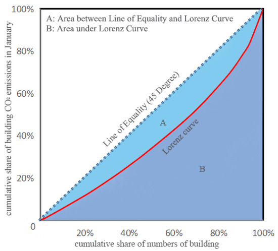 where SA is the area between the equality line and the Lorenz curve, and SB is the area under the Lorenz curve. xi is the cumulative share of numbers of building up to county i, and yi represents the cumulative share of building CO2 emissions quotas up to county i.