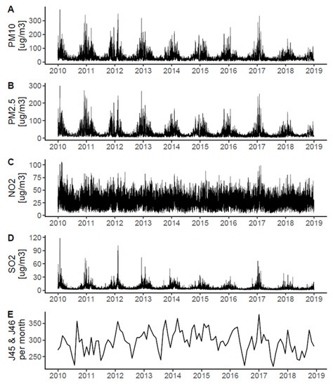 Daily concentrations of PM10 (A), PM2.5 (B), NO2 (C), and SO2 (D) in the study period. Monthly counts of hospitalizations due to the J45 or J46 ICD-10 codes (E) (“asthma”).